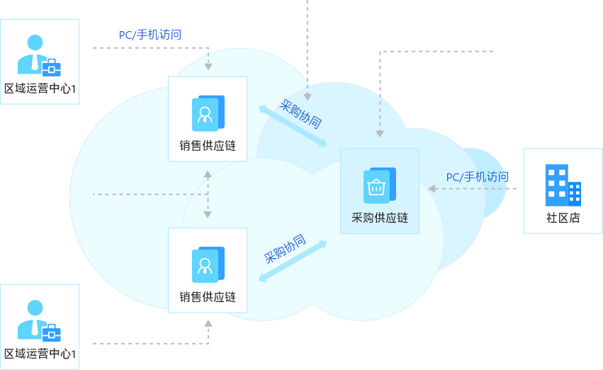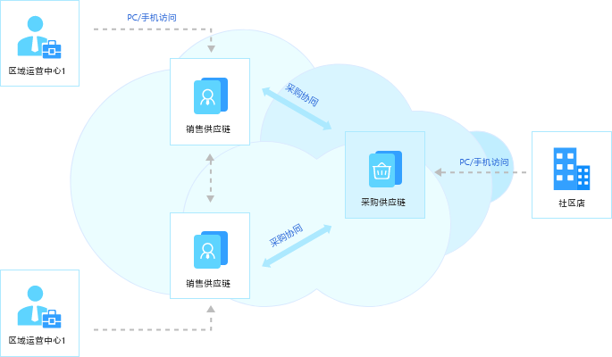 社区店(Hub)通过上平台协同业务,实现业务订单全生命周期管理和数据可视化。同时可以根据上游供应商(spoke)信息化协同意愿进行场景配置